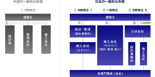 また、中國國內における日系もしくは歐米の建設會社が建設を擔當する場合は、設計?監理?を外注委託し、施工はローカル建設會社に下請けとして発注を行っています。この場合、日系建設會社が入ることによってコストが高くなり、下請け企業間でのコミュニケーションがスムーズに行われにくい等の問題があり、対応力の低下が発生してしまいます。